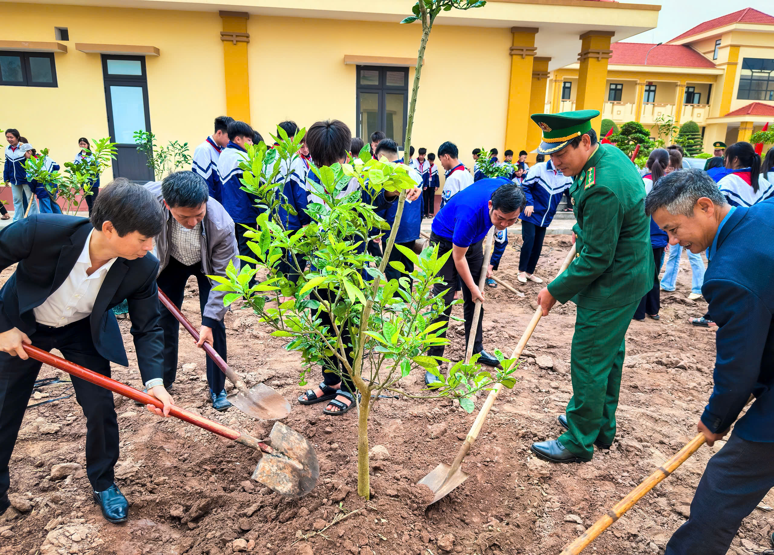 Ảnh 2: Các em học sinh hăng hái lao động trồng cây.